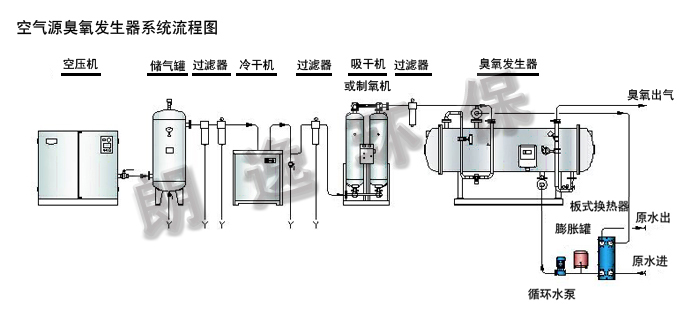 當冷卻水水質不好的情況下,一般采用封閉式循環冷卻水系統,外部采用水質相對較差的水源通過板式換熱器對內循環水冷卻。而內循環水一般采用去離子水或軟化水,保證對臭氧發生器放電室不腐蝕,不結垢。